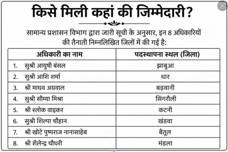 भोपाल: मध्य प्रदेश में प्रशासनिक व्यवस्था को अधिक जनोन्मुखी और संवेदनशील बनाने की दिशा में मुख्यमंत्री डॉ. मोहन यादव ने एक महत्वपूर्ण निर्णय लिया है। सामान्य प्रशासन विभाग द्वारा 24 अप्रैल 2026 को जारी आदेशों के अनुसार, वर्ष 2025 बैच के 8 प्रोबेशनरी आईएएस (IAS) अधिकारियों को राज्य के विभिन्न जिलों में पहली बार 'फील्ड पोस्टिंग' दी गई है।