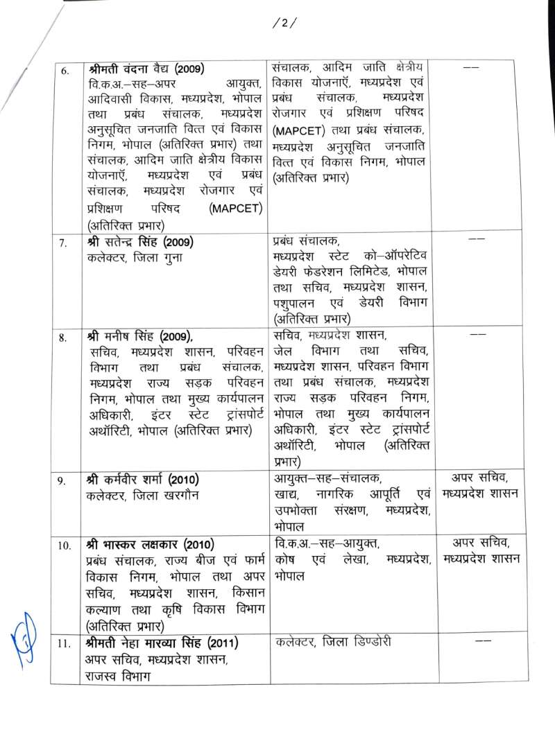 मुख्यमंत्री के सचिव भरत यादव को मध्य प्रदेश सड़क विकास निगम का प्रबंध संचालक बनाया गया है, जबकि उनके स्थान पर सीबी चक्रवर्ती एम को मुख्यमंत्री डॉ. मोहन यादव का सचिव बनाया गया है। इसी तरह आईएएस अधिकारी ललित कुमार को राजस्व मंडल ग्वालियर का सदस्य, अविनाश लवानिया को मध्य प्रदेश पावर मैनेजमेंट कंपनी लिमिटेड जबलपुर का प्रबंध संचालक, वंदना वेद को आदिम जाति क्षेत्र विकास योजना का संचालक, सत्येंद्र सिंह को एमपी स्टेट कोऑपरेटिव डेयरी फेडरेशन लिमिटेड का प्रबंध संचालक, मनीष सिंह को जेल और मध्य प्रदेश परिवहन विभाग का सचिव बनाया गया है। इसी तरह कलेक्टर खरगोन कर्मवीर शर्मा को आयुक्त सह संचालक खाद्य नागरिक आपूर्ति निगम की जिम्मेदारी दी गई है।