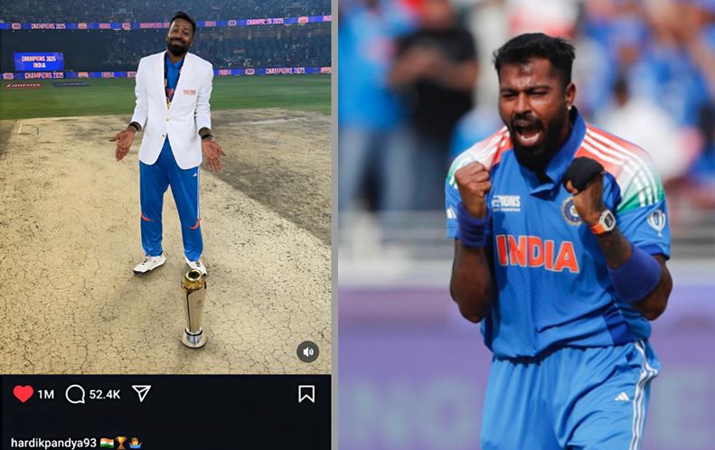 Hardik Pandya: ऑलराउंडर हार्दिक पांड्या ने चैंपियंस ट्रॉफी में बल्ले और गेंद, दोनों से महत्वपूर्ण योगदान दिया. क्रिकेट मैदान पर तो उन्होंने कई रिकॉर्ड बनाए हैं. लेकिन अब उन्होंने सोशल मीडिया पर भी एक बड़ा रिकॉर्ड बना दिया है. उन्होंने एक इंस्टाग्राम पोस्ट किया, जिसमें कुछ मिनटों में लाइक की संख्या लाखों में पहुंच गई. इस बीच उन्होंने विराट कोहली का एक बड़ा रिकॉर्ड भी तोड़ दिया. फाइनल जीतने के बाद हार्दिक पांड्या चैंपियंस ट्रॉफी को लेकर पिच पर गए, वह अपने साथ अक्षर पटेल को लेकर गए. ताकि वह उनकी फोटो खींच सके. इस दौरान करीब दर्जनों कैमरामैन भी वहां पहुंच गए. पांड्या ने पिच पर ट्रॉफी के साथ अपना आइकोनिक पोज दिया, जो उन्होंने 2024 टी20 वर्ल्ड कप जीतने के बाद भी दिया था.