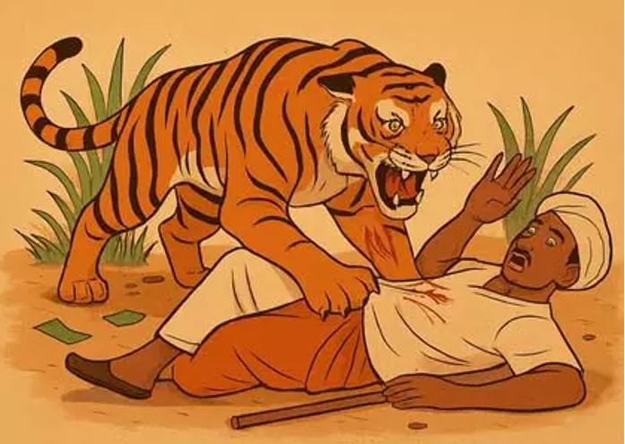 टाइगर का डरावना मंजर: शिकार के इंतजार में झाड़ियों में बैठा था खूनी बाघ, किसान दिखते ही टूट पड़ा – सेकंडों में बचाई जान