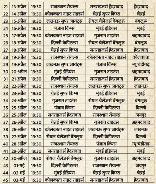 बीसीसीआई ने पहले 12 अप्रैल तक के मैचों का कार्यक्रम जारी किया था और अब 13 अप्रैल से 24 मई तक का शेड्यूल बता दिया है। दूसरे चरण में 12 वेन्यू पर आईपीएल के मुकाबले खेले जाएंगे, जबकि आईपीएल 2026 में कुल 13 स्थानों पर मैच होंगे। दूसरे चरण में बंगलूरू, मुंबई, चेन्नई, कोलकाता, दिल्ली, अहमदाबाद, हैदराबाद, लखनऊ, जयपुर, धर्मशाला, रायपुर और न्यू चंडीगढ़ में मुकाबले होंगे। पहले चरण में गुवाहाटी भी आईपीएल मैचों की मेजबानी कर रहा है, लेकिन दूसरे चरण में वहां मैच नहीं होंगे। दूसरे चरण की शुरुआत 13 अप्रैल को सनराइजर्स हैदराबाद और राजस्थान रॉयल्स के खिलाफ हैदराबाद में होने वाले मैच से होगी। वहीं, लीग चरण का अंतिम मैच 24 मई को केकेआर और दिल्ली कैपिटल्स के बीच कोलकाता में खेला जाएगा।