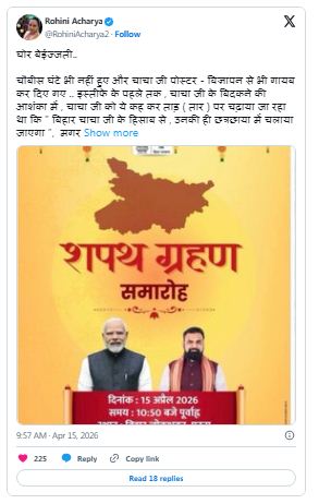 रोहिणी आचार्य ने सोशल मीडिया प्लेटफॉर्म एक्स पर शपथ ग्रहण का एक विज्ञापन साझा किया है। इस विज्ञापन में शपथ ग्रहण समारोह का स्थान, समय और दिनांक बताया गया है। इसके अलावा पोस्टर में बिहार के नक्शे के साथ प्रधानमंत्री नरेंद्र मोदी और मुख्यमंत्री सम्राट चौधरी की बड़ी तस्वीरें हैं, लेकिन नीतीश कुमार कहीं नजर नहीं आ रहे। इस पोस्टर को रोहिणी आचार्या ने नीतीश कुमार की घोर बेइज्जती बताया है।