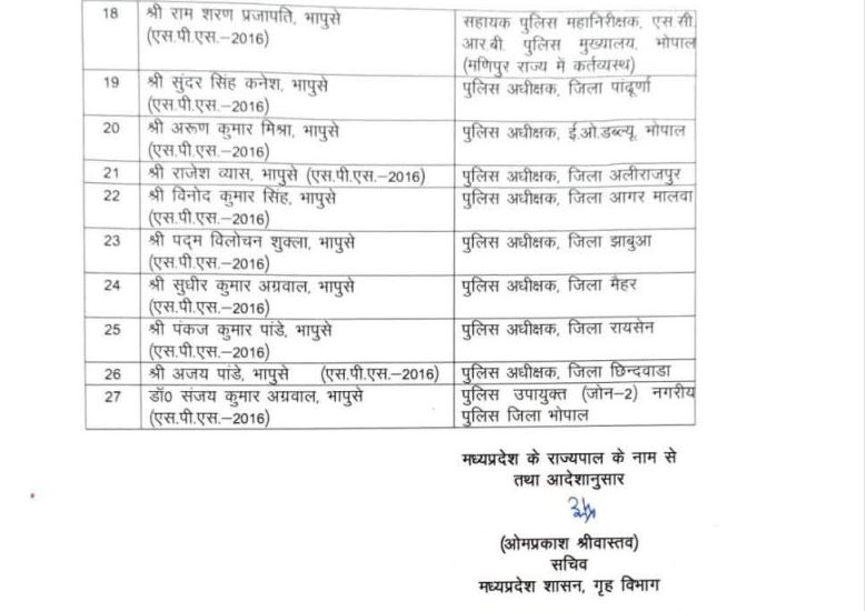 भोपाल। 27 पुलिस अधिकारियों को भारतीय पुलिस सेवा का कनिष्ठ प्रशासनिक ग्रेड स्वीकृत किया गया है। इस संबंध में आज आदेश जारी किए गए हैं।