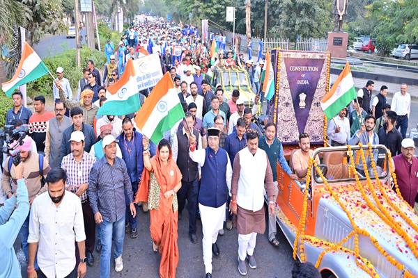 भोपाल : खेल एवं युवा कल्याण मंत्री विश्वास कैलाश सारंग ने कहा कि हमारे देश का संविधान ही धर्मग्रन्थ है। उन्होंने प्रधानमंत्री नरेन्द्र मोदी का साधुवाद करते हुए कहा कि सम्पूर्ण देश में आज संविधान दिवस पर पद यात्रा का आयोजन कर हम सबको प्रेरणा दी है कि लोकतंत्र में आज हम आजाद हिन्दुस्तानी के नाते जी रहे है। मंत्री सारंग शौर्य स्मारक में संविधान दिवस पद यात्रा के शुभारंभ अवसर पर कार्यक्रम को संबोधित कर रहे थे।